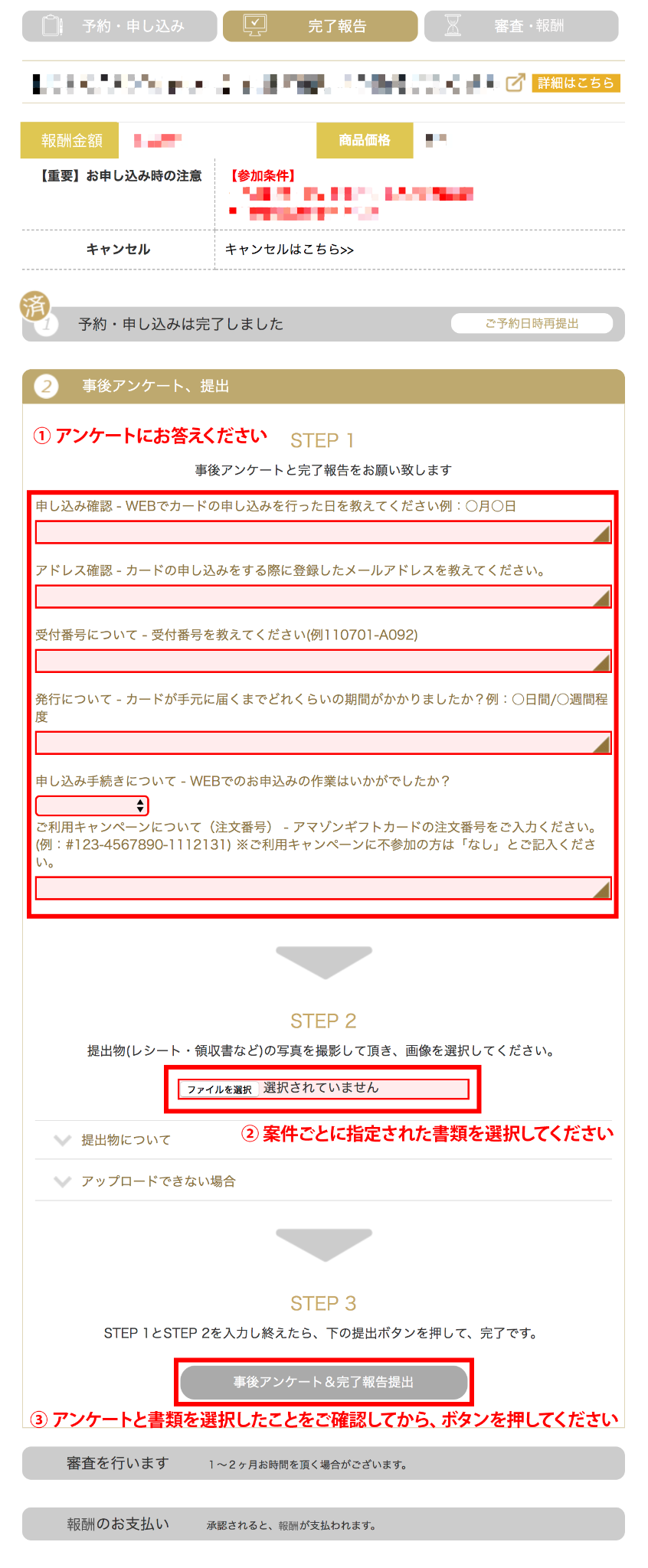 事後アンケートにお答えいただき、必要な書類を撮影、アップロードしてください
