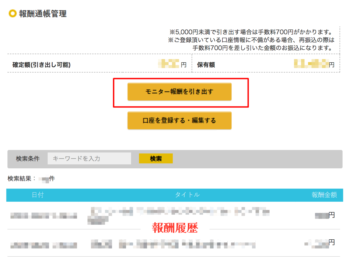 案件の獲得金額や引き出し金額の履歴を確認できます。
