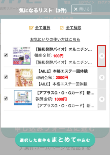 (2)赤枠で囲った「x」ボタンを押すと、気になるリストに追加した案件を削除できます。