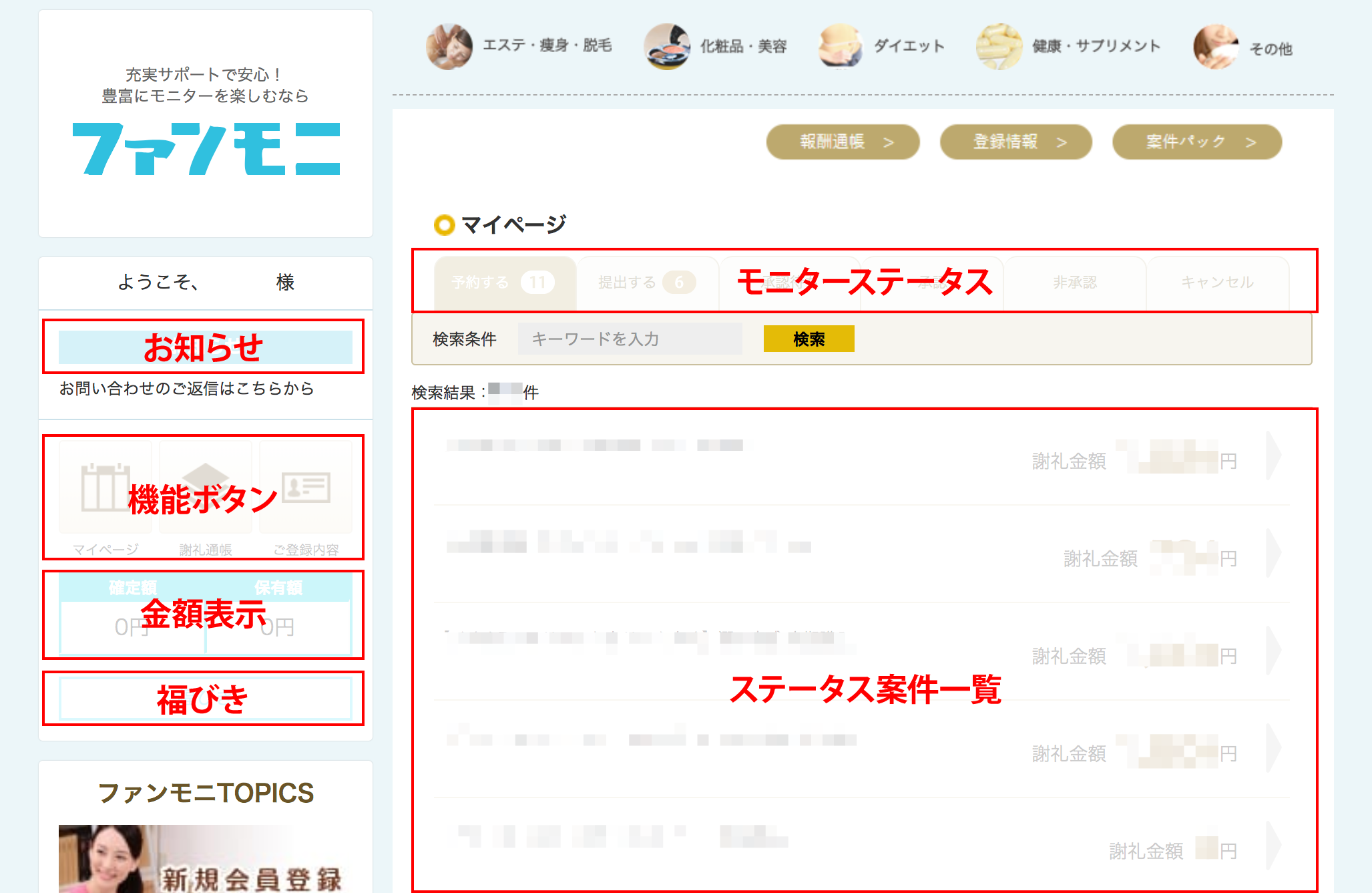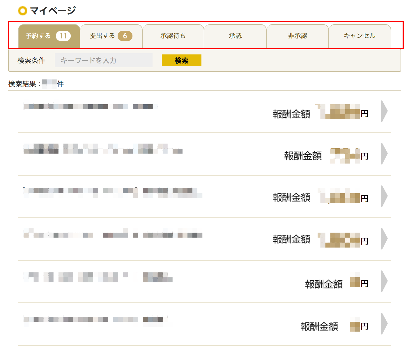 - 【機能ボタン】:「マイページ」「報酬通帳」「ご登録内容」へのリンクです。