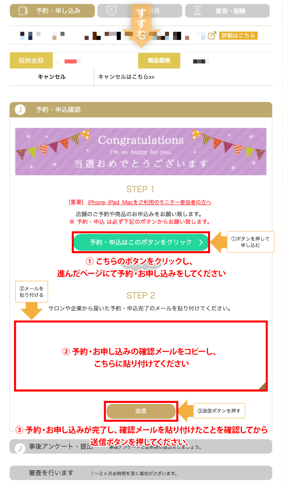 - 別のページに進んでしまった場合、戻るボタンで戻らず、ファンモニの予約・申し込みページからやり直してください